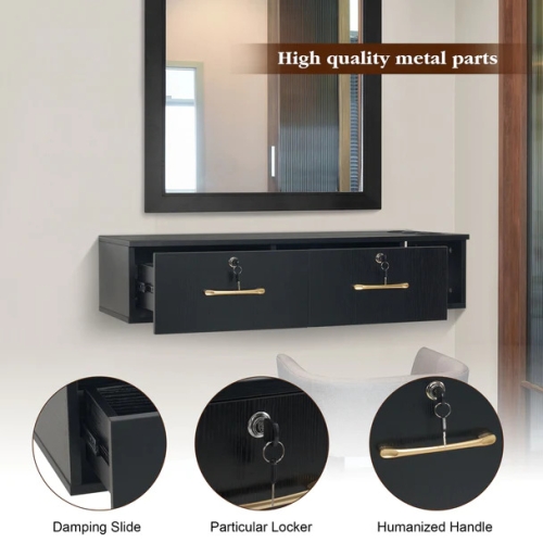 The design style of the line wall-mounted styling station is simple and generous. The streamline design will make stores look more neat and beautiful. The drawer handles make the whole styling station bright. The right side is designed with a storage compartment for heating tools, which is more user-friendly. With this beautiful barber station, stores will look more advanced.