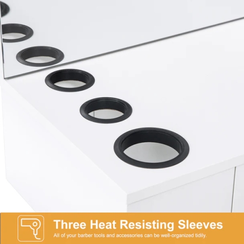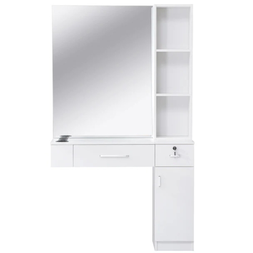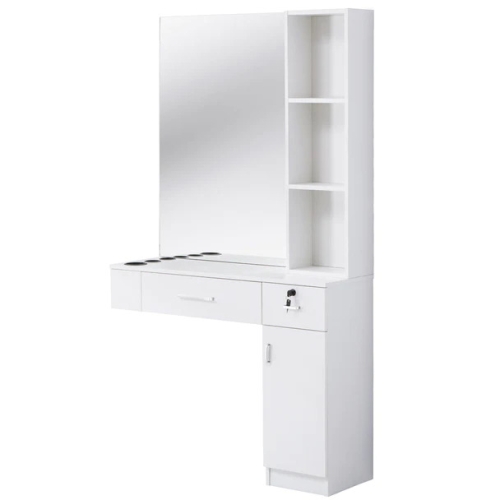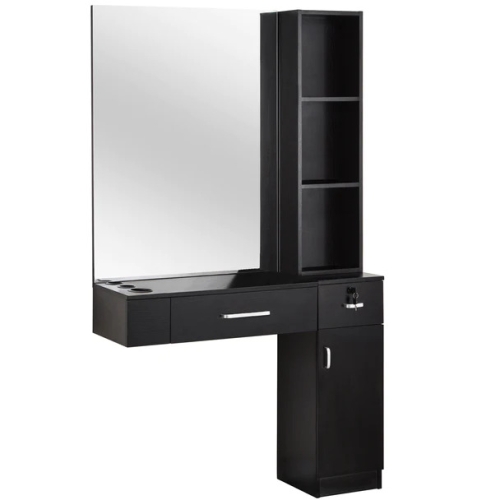 This wall-mounted styling station is a multifunctional workstation with ample storage. It is European contemporary style design. The streamline design makes it a beautiful look in just about any salon. The station frame is made from particle board. The particle board surface is veneered in slick uniform black/white/red&black color. The veneer decorative board increases the brightness of the surface, protects the surface from worn, and is easy to clean.