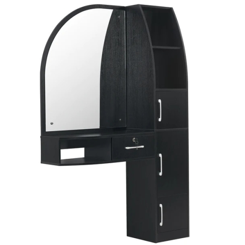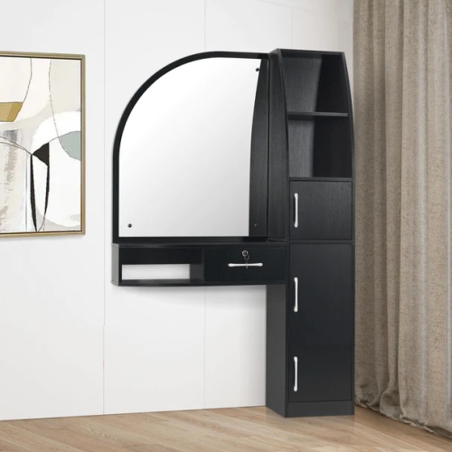 This is a multifunctional workstation for spa, salon, beauty, and home styling with ample storage space with cabinets, drawers and shelves. The work station is made of particle board which is smooth and easy to clean. The beautiful barber station with classic design reflects your elegant and refined taste and impresses customers with your salon store.