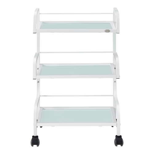 Designed for the professional environment, the Damien medical spa trolley cart is an indispensable piece of salon spa equipment. The Damien makeup trolley cart is built for outstanding durability on industrial strength steel. The Damien cosmetology trolley cart sports three glossy frost tempered glass shelves for a touch of soft elegance to accentuate high end spa, reception, and medical offices, where quality casters allow the Damien esthetician cart trolley to move wherever it is needed most, with the greatest of ease.