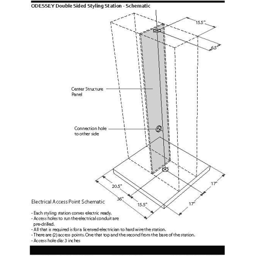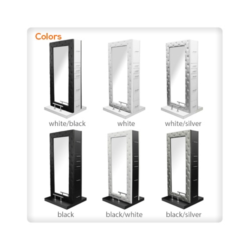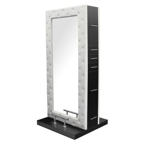 The Elizabeth double sided styling station is a polished and contemporary model. Featuring a large tufted mirror, tons of storage, and chrome footrests, this styling station is a client favorite. Available in 6 color combinations.