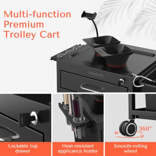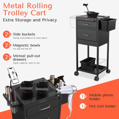 - NEW UPGRADE FOR EXTRA CONVENIENCE with two side plastic buckets,two magnetic bowls, one mobile phone holder, one heat-resistant hair dryer holder, two pull-out drawers one lockable , one dryer holder. A multifunctional rolling trolley cart that can meet your needs in any occasion.