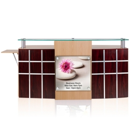 Browse through our selection reception desks to match the other furniture you have selected for your spa/ salon. We have a plethora of colors shapes and sized. Find the reception desk that will compliment your reception area.