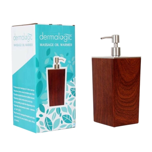 Elegant and contemporary massage oil warmer! The Dermalogic warmer, with cherry wood laminate container, brushed aluminum bottle, and stainless steel pump top, will maintain 8.5 oz of your massage oil / lotion at a temperature of 140F (60C). A must have for the professional masseuse / masseur or for your home spa!