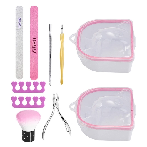 - Great nail polish remover tools 10 in one kit: you will get 2pcs hand soak bowl(blue or pink), 1 pieces nail files and 1 pieces buffer sanding block, 1 pc dead skin fork, 1 pair dead skin scissor, a pair of toe separator,1PC nail brush,1PC cuticle pusher