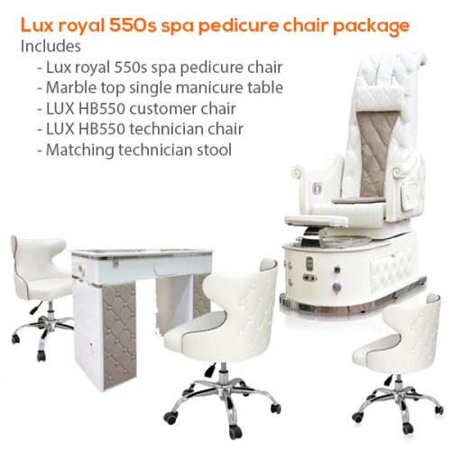 - 1x LUX HB550 Pedicure Chair (available color PEARL WHITE or MODERN GREY): Acetone-Resistant upholstery leather and body, built-in remote control for customer and technician, seat cover pad, Pro-Touch massage system, power seat, built-in air vent, LUX SMART magnet jet, and 3 year warranty.