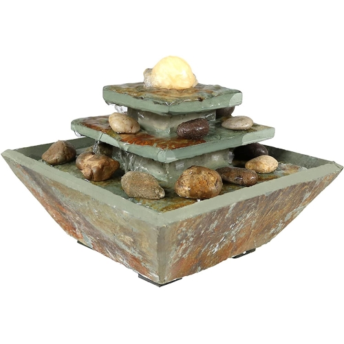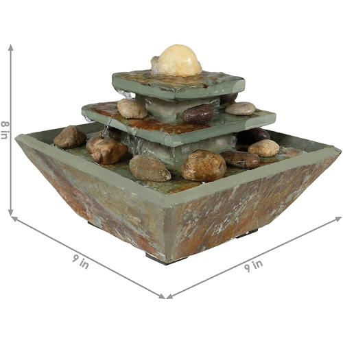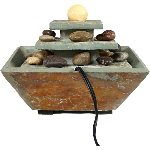 Relax, destress, and unwind with this slate table top fountain. With its warm, earthy colors, and unique ascending tiered style, it's the perfect item to accent and compliment any room in the home. Turn on its built-in LED light to softly illuminate any room while unwinding from a busy day, or simply taking the time to listen to its peaceful trickle of water. Plus, no plumbing is required; simply plug the fountain in once it has been assembled and filled with water.